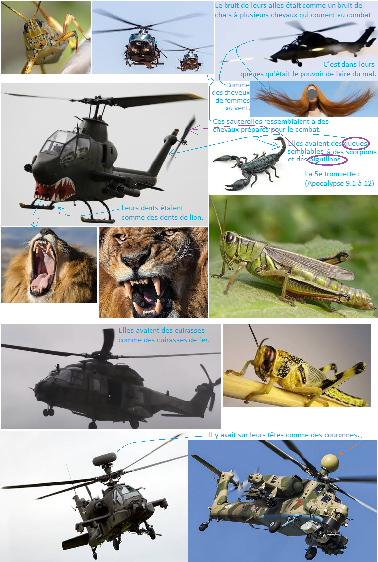 1)- un puits d'où les sauterelles sortent (v.2) = l'ouverture d'une base souterraine de l'armée d'où les hélicoptères sortent. 2)- de la fumée sortirent des sauterelles (v.3) = la fumée du caburant des hélicoptères ou la brume de condensation entre le chaud et le froid. 3)- ressemblaient à des chevaux préparés pour le combat (v.7) = un groupe de plusieurs hélicoptères de combat, 4)- leurs visages étaient comme des visages d'hommes (v.7) = la forme spéciale de certains types d'hélicoptères modernes vus de devant fait penser à un visage humain. À l'époque de l'apôtre Jean, en Israël, beaucoup d'hommes portaient la barbe. Mais aussi, de près, au travers du pare-brise, on peut voir le visage de l'homme assis à l'intérieur de l'hélicoptère. 5)- comme des sauterelles (v.3) = des hélicoptères ressemblent à des sauterelles. 6)- sur leurs têtes comme des couronnes (v.7) = forme circulaire ou sphérique au-dessus des hélices servant pour le radar. 7)- des cheveux comme des cheveux de femmes (v.8) = l'apparence des hélices qui tournent rapidement fait penser à de longs cheveux qui flottent au vent. 8)- leurs dents étaient comme des dents de lions (v.8) = certains hélicoptères de l'armée ont des dents de lions dessinées à l'avant. 9)- des cuirasses comme des cuirasses de fer (v.9) = les hélicoptères sont en métal. 10)- comme un bruit de chars à plusieurs chevaux qui courent (v.9) = c'est un bruit qui ressemble au bruit que font les hélicoptères. 11)- des queues semblables à des scorpions (v.10) = c'est la forme alongée de la queue d'un hélicoptère, 12)- et des aiguillons (v.10) = les deux bouts de l'hélice qui tourne sur la queue de l'hélicoptère. 13)- dans leurs queues était le pouvoir de faire du mal (v.10) = des missiles attachés de chaque côté de la queue de l'hélicoptère. Il y a 2000 ans, qui de nous aurait pu donner une description aussi précise d'hélicoptères allant au combat, sans en avoir jamais vu ni savoir ce que c'était ? |